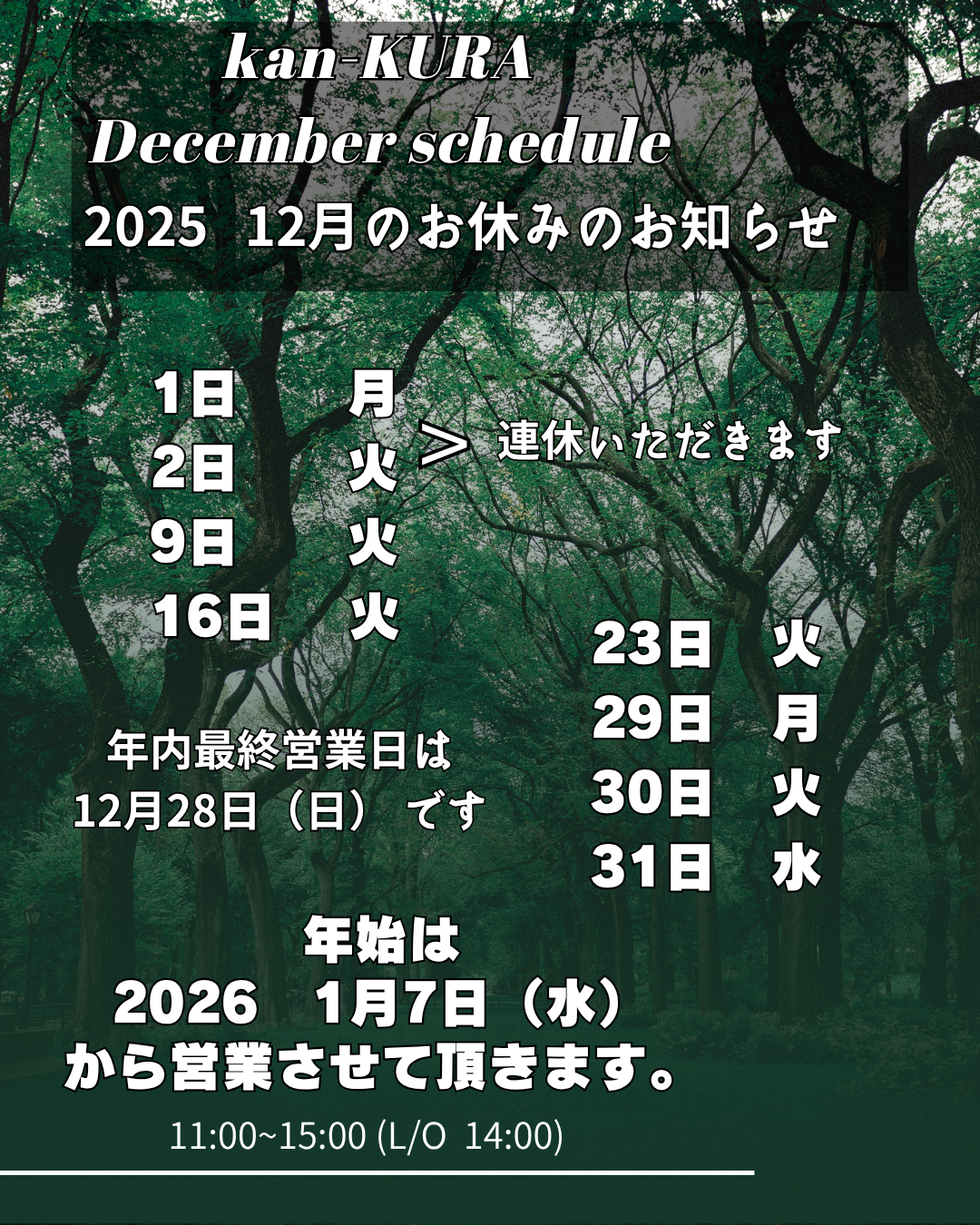 12月最終営業日は28日(日)までとさせていただきます。